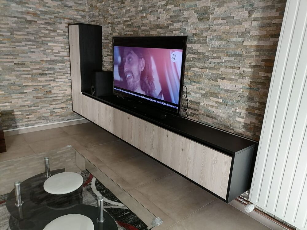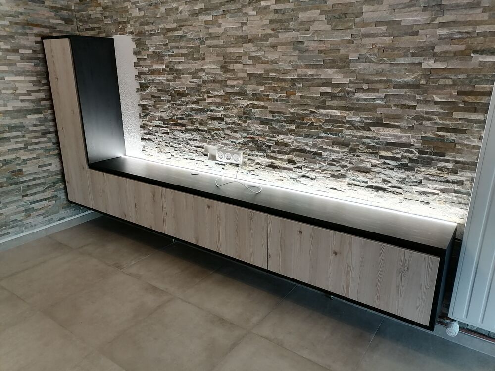 Meuble supsendu bas pour TV avec rangements et éclairage led