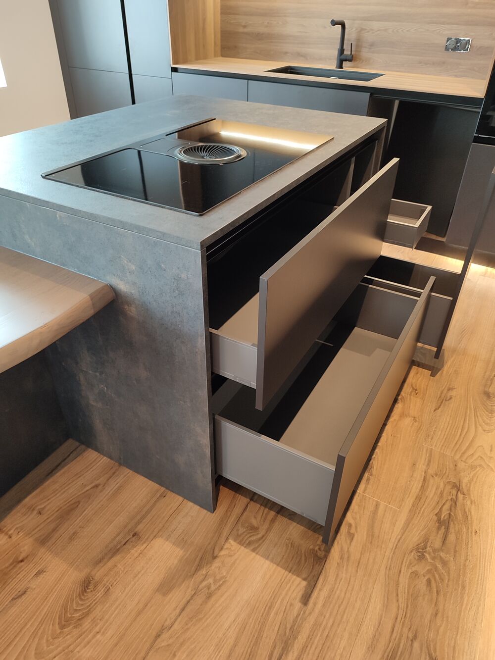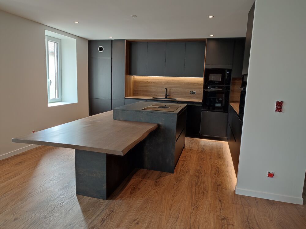 Ilot central équpée d'une plaque induction aspirante + plateau table en bois massif.