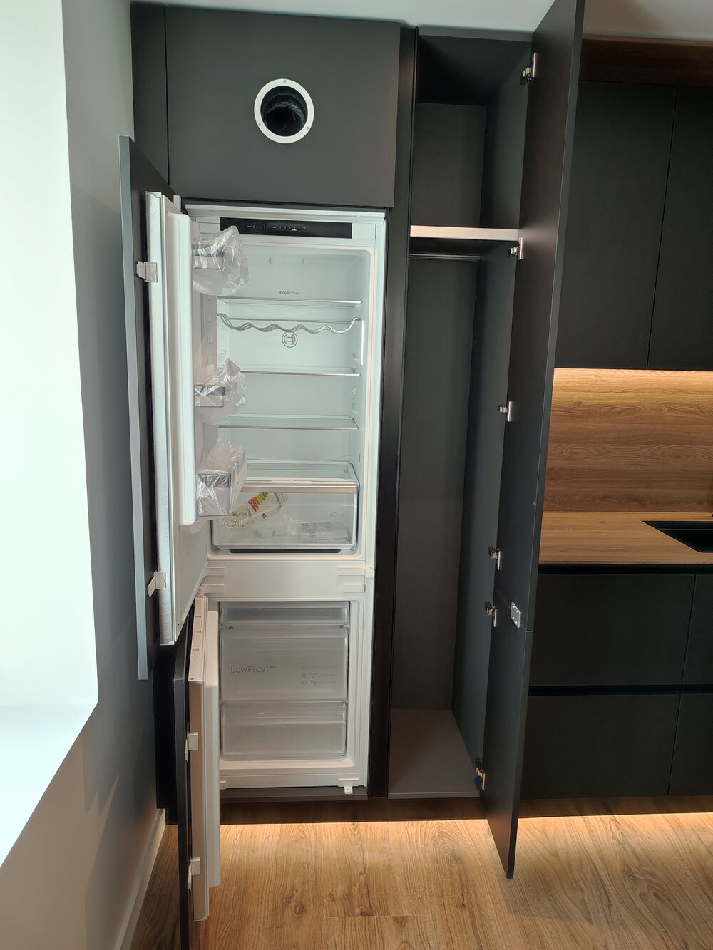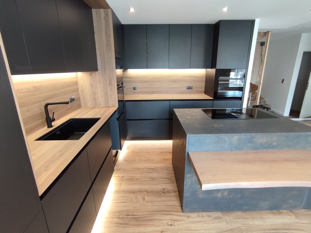 Agencement d'une cuisine moderne noir mat, plan de travail compact club et stratifié fusion. Composée de crédences niches avec led intégrée, pack évier, frigo, fours et cave à vin.