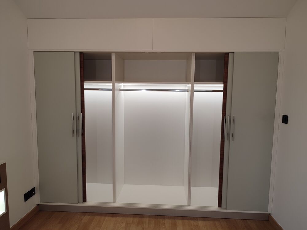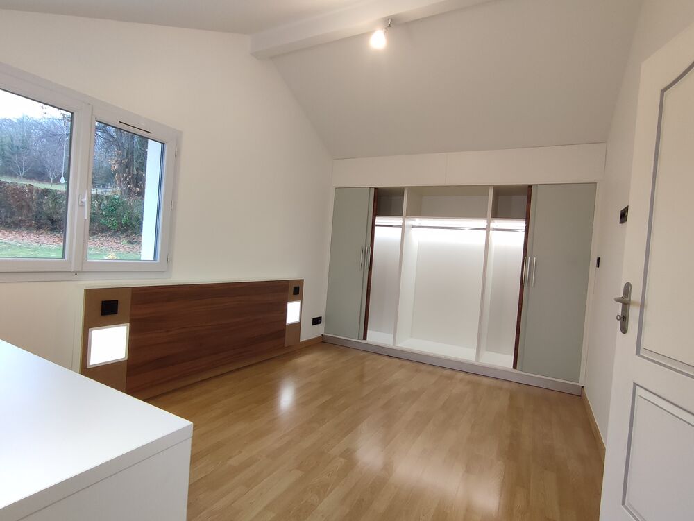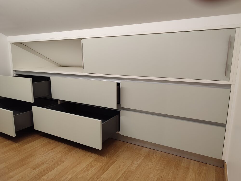 Penderie sous pente de toit composée de 6 façades coulissantes, éclairage led, étagères + rangement sous mansarde composée de 6 tiroirs et 2 étagères avec façades coulissantes