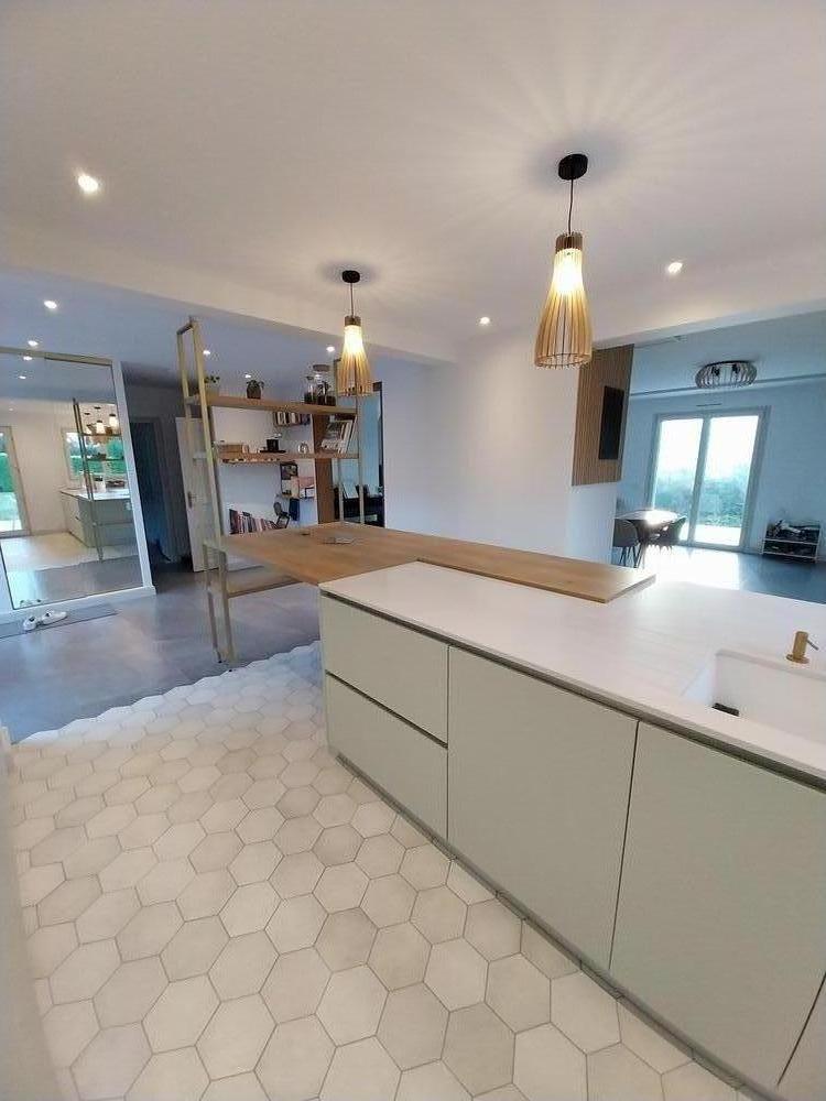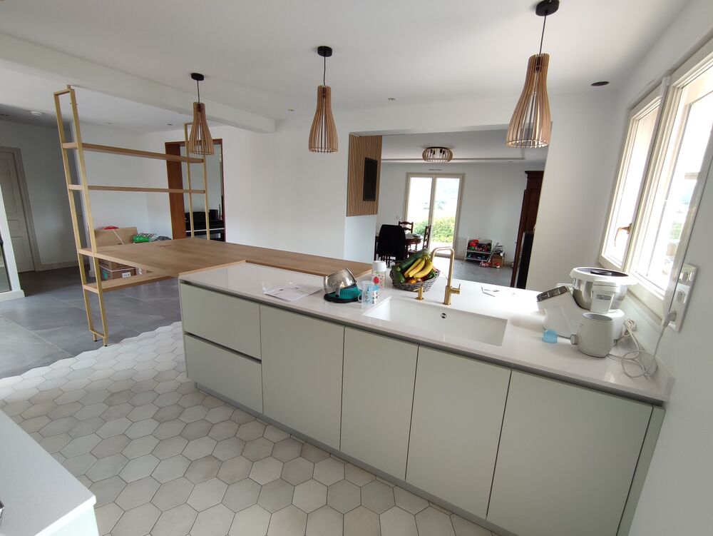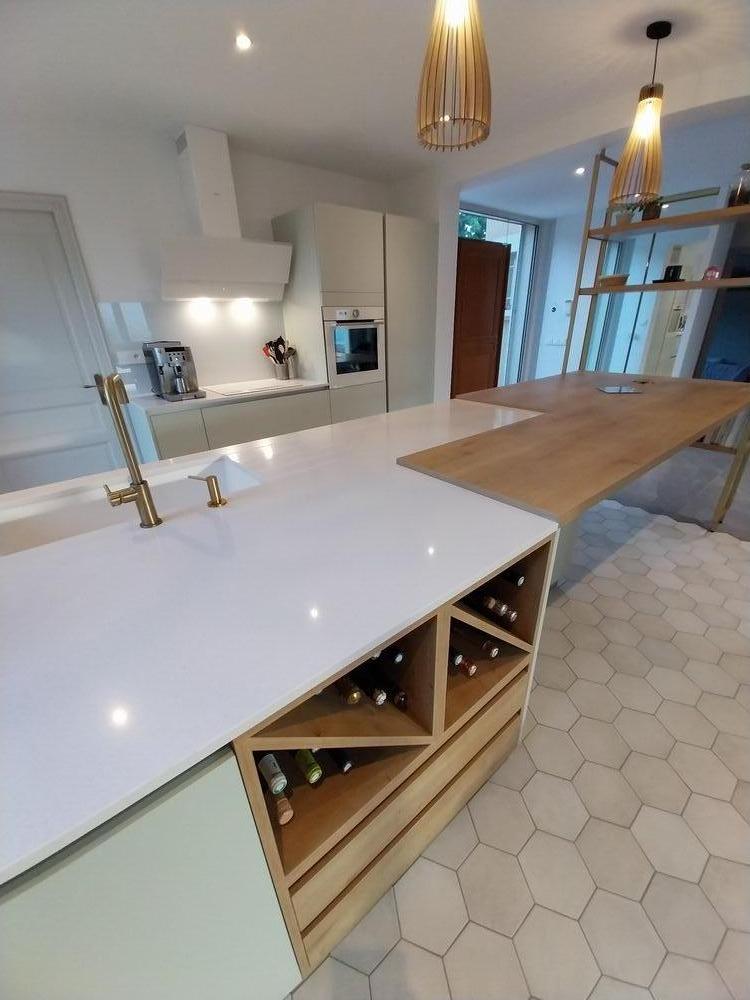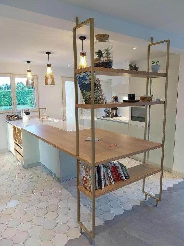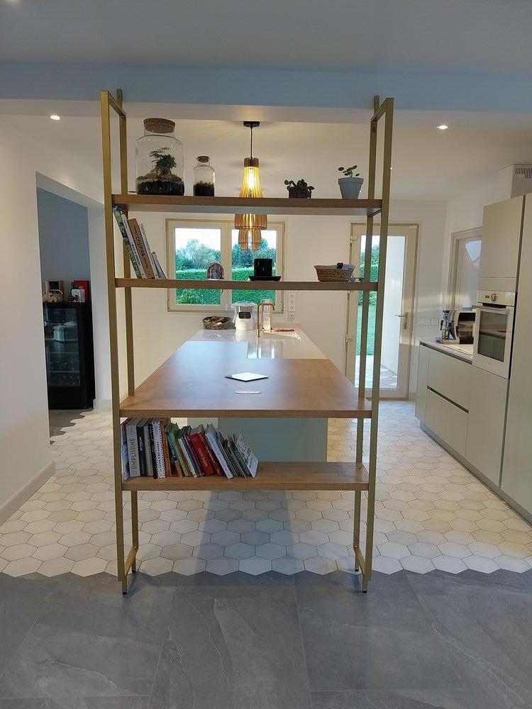 Côté plan de travail et coin repas : meuble bas avec coffres-tiroirs, portes et étagères, niche de rangement, cadre d'étagére en acier, prises encastrées au plan de travail.