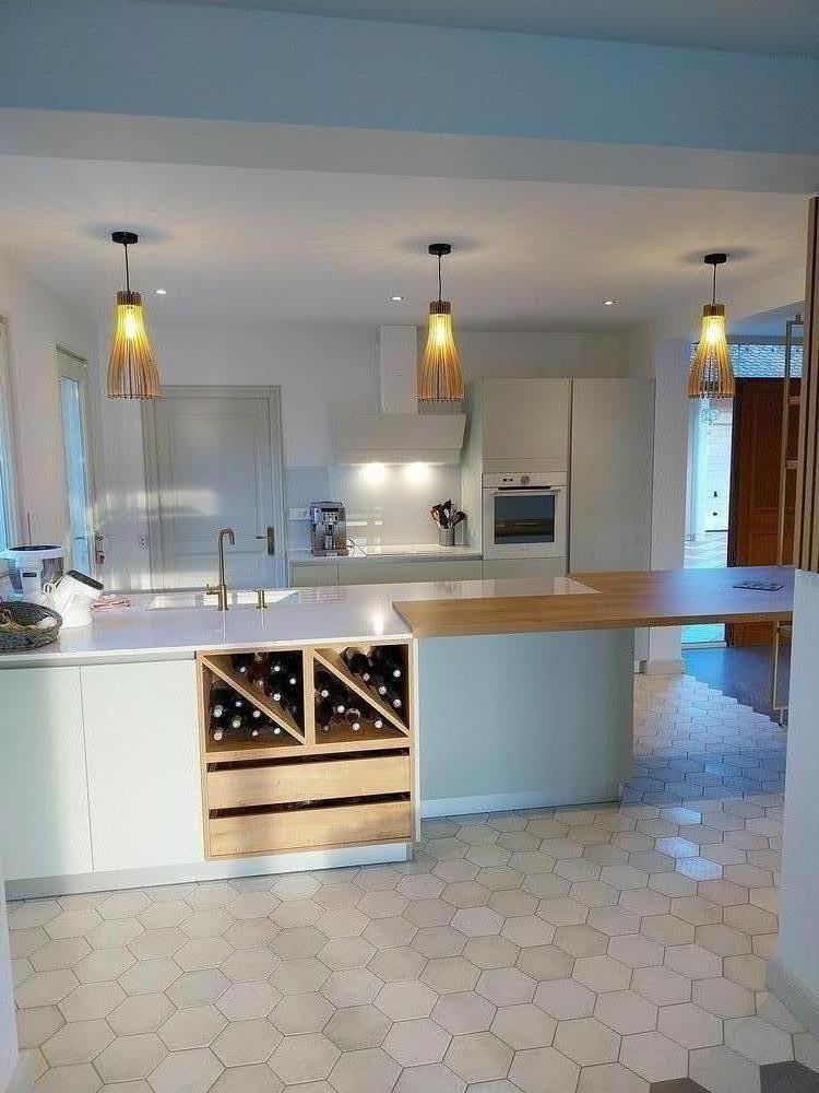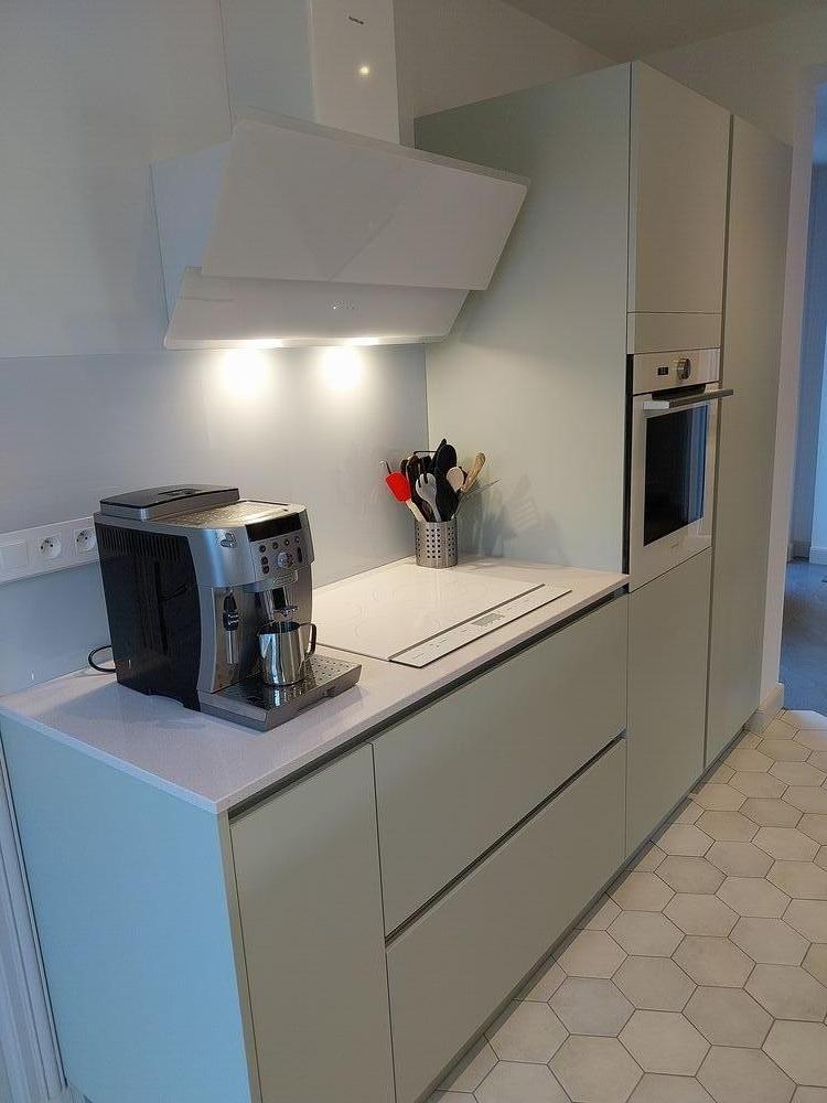 Côté cuisson : meuble bas , emplacement plaque induction, four, réfrigérateur intégrés. Hotte verticale, crédence vitrage trempé.
